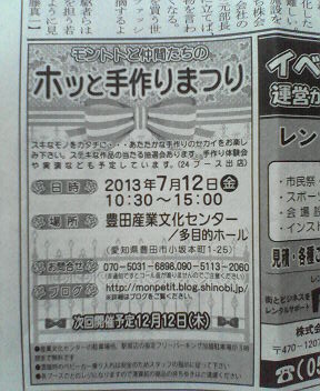 × [PR]上記の広告は3ヶ月以上新規記事投稿のないブログに表示されています。新しい記事を書く事で広告が消えます。 新三河タイムスさんに広告を掲載しました~♪ コラボさん、中日ホームニュースさん、フリースペースK「この指とまれ」さんにも情報を掲載します。 ★モントトと仲間たちのホッと手作りまつり★ *2013年7月12日(金)10:30~15:00 *豊田産業文化センター 多目的ホール (愛知県豊田市小坂本町、名鉄豊田市駅 愛環新豊田駅 より徒歩5分) *手作り作家さん23ブースと手作りパン屋さんが1ブースで全部で24ブース出店。作品の展示、販売のほか、実演や体験会もあります。(携帯ペイントは、東日本大震災義援金として寄付させていただきます) 毎回好評のお楽しみ抽選会も開催いたします。あたたかな手作りのセカイお楽しみにいらしてくださいね(*^^*) ★ ブース出店者 ★ ★ Atelier Chiffon de Chiffon (布こもの、お洋服など) ★ アメリカンフラワー久美 & さくらひめ (アメリカンフラワー) ★ Open Sesame!(布こもの、エコクラフトなど) ★ カトンテール(布こもの、和のお洋服) ★ 皮雑貨工房UGLY(皮雑貨) ★ Country Craft Ribon (エコクラフト、木工他) ★ かんとりぃはぁとM&ShizuShizu (木工、トールペイント) ★ タイカービングgulaap&artyarty (タイカービング、アクセサリー) ★ グラスアート&アクセサリー 玻璃工房(グラスアート、アクセサリー) ★ cat's paw (布こものなど) ★ くろうばぁ(アンティーク小物、ジャンク雑貨) ★ jujube (布こものなど) ★ ジーコ・ダーノ (木工) ★ Serendipity (クレイ) ★ Soramoyou(布こもの、お洋服) ★ TON't (木工) ★ Tole Painting EACH (トールペイント) ★ 75+(布こもの、皮こもの、羊毛など) ★ Honey pot (布こものなど) ★ Petite Rose (布こものなど) ★ ボン・シャンテ (パン、お飲み物) ★ みこらぼすいーつ(デコスイーツなど) ★ ロザフィSrosy(ロザフィ) ★ モントト (布こもの、ドライフラワー、トールペイントなど) PR ![]() ![]() |