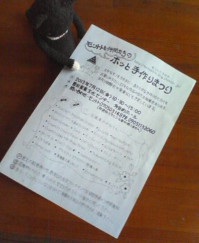 7月12日(金)の「モントトと仲間たちのホッと手作りまつり」に参加される出店者さん、作家さんにお知らせいたします。 すでに各ブースの出店者さん(グループで参加される方は代表の作家さん)にお便りを送らせていただきましたが、ブログで出店者さん、作家さんの紹介をしたいので、7月9日(火)23時までに、下記のことを スタッフ安斎までメールしてください。 スタッフ安斎メール k-anzai★msg.biglobre.ne.jp(★を@に変えてください) *出店者名(作家さん個人で送ってくださる場合は、ブース名と作家さん名) *作品の写真1~3枚(50KB以下。携帯で撮ったような画像数が小さいものがいいです。) *コメント(作品内容や近日中にご自分が出展される作品展やイベントの宣伝もどうぞ♪) *HPやブログ(ある方は) ご無理はなさらなくてけっこうですが、よければご協力くださいませ m(__)m PR