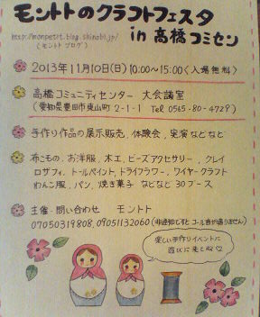 × [PR]上記の広告は3ヶ月以上新規記事投稿のないブログに表示されています。新しい記事を書く事で広告が消えます。 モントトのクラフトフェスタin高橋コミセンのブース出店者さんを募集しています♪ 高橋コミュニティーセンターのお祭りの中の催しもののひとつとして開催する手作りイベントです。 屋外では、フリマや農産物販売コーナー、お子さんの遊びイベント、ほかの会議室でも各種展示や発表会などが行われる楽しいイベントです。 昨年の様子はこちらをごらんください ●日時:2013年11月10日(日)10:00~15:00 ●場所:高橋コミュニティセンター 大会議室 (豊田市東山町2-1-1 TEL0565-80-4729)(イオン高橋店そば) ●搬入:2013年11月9日(土)14:00~17:00、11月10日(日)8:30~9:30(9:30より開会式がありますので、9:30までに搬入終了してくださるようお願いします) 前日9日の14時より各ブース1人、ブース分け、備品出しのお手伝いをお願いします(30分程度) お手伝い不可能のブースは出店参加を見合わせてください。 ●搬出:2013年11月10日(日)15:00~16:00 ●ブース:1ブース3m×2m50㎝、一人(1グループ)2ブースまで取れます 1ブース1500円(会場費、宣伝費として使い、余った場合は震災寄付としますことをご了承ください) ●備品:1ブースにつき長机(60cm×180cm)1脚、椅子数脚 を無料で使用できます(出店者で出し片付ける)長机が足りない場合は1脚500円にて貸し出します(数に限りあり)今回はパネルなし。*直に床に敷物を敷いての出店もOKです。 ●出店内容:オリジナルの手作り雑貨、クラフト作品、手作り工芸品 手芸材料(余剰品、使わなかったものOK)など 手作りの体験会や実演(占いやリラクゼーションなど手作りに関係ないことはしないでください)食品は今回は、パンのブースのみで出店決定しています。 *全部で30ブース、現在、残り15ブースです。 出店を希望される方は、 お名前、連絡先(携帯電話アドレスまたはPCアドレス、携帯電話番号)、出品物(例・・・布こもの) を記してメールの件名を「高橋コミセンクラフトフェスタ出店希望」としスタッフ安斎まで、下記アドレスにてご連絡ください。15ブースに達した時点で締め切らせていただくことをご了承ください。 スタッフ安斎 k-anzai★msg.biglobe.ne.jp (★を@に変えてください) PR