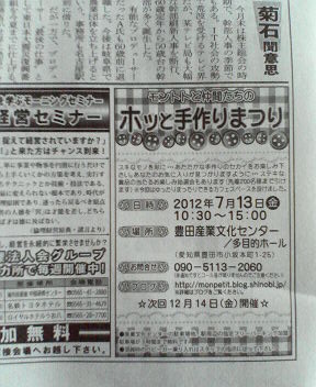 出店者さんのご紹介です♪ ~ ママと花 ~ かわらしいフラワーアレンジのお店です。 お値段もお手頃♪ お部屋や玄関などに、ちょこんと飾っておくととても素敵です(*^^*) ★モントトと仲間たちのホッと手作りまつり★ *2012年7月13日(金)10:30~15:00 *豊田産業文化センター 多目的ホール (愛知県豊田市小坂本町、名鉄豊田市駅 愛環新豊田駅 より徒歩5分) *素敵な作品が当たる抽選会あります♪ ゆったりまったりのカフェブースも設けました♪ ★ ブース出店者 ★ ★ Atelier Chiffon de Chiffon (布こもの、お洋服など) ★ アメリカンフラワー久美 & さくらひめ (アメリカンフラワー) ★ Open Sesame!(布こもの、エコクラフトなど) ★ Country Craft Ribon (エコクラフト、木工他) ★ かんとりぃはぁとM&ShizuShizu (木工、トールペイント) ★ タイカーピングgulaap&artyarty (ソープカービング) ★ グラスアート&アクセサリー 玻璃工房(グラスアート、アクセサリー) ★ cat's paw (布こものなど) ★ くろうばぁ(アンティーク小物、ジャンク雑貨) ★ jujube (布こものなど) ★ ジーコ・ダーノ (木工) ★ Serendipity (クレイ) ★ TON't (木工) ★ tomoko (布こもの) ★ Tole Painting EACH (トールペイント) ★ 75+(布こもの、皮こもの、羊毛など) ★ Honey pot (布こものなど) ★ Petite Rose (布こものなど) ★ ボン・シャンテ (パン) ★ ママと花 (アレンジフラワー) ★ カトンテール(布こもの、和のお洋服) ★ モントト (布こもの、アクセサリ、ドライフラワー、トールペイントなど) ↑新三河タイムスさんに宣伝広告を掲載しました♪ 豊田市内の各交流館や銀行、お店などでごらんになれます♪ ★モントトと仲間たちのホッと手作りまつり★ *2012年7月13日(金)10:30~15:00 *豊田産業文化センター 多目的ホール (愛知県豊田市小坂本町、名鉄豊田市駅 愛環新豊田駅 より徒歩5分) *素敵な作品が当たる抽選会あります♪ ゆったりまったりのカフェブースも設けました♪ ★ ブース出店者 ★ ★ Atelier Chiffon de Chiffon (布こもの、お洋服など) ★ アメリカンフラワー久美 & さくらひめ (アメリカンフラワー) ★ Open Sesame!(布こもの、エコクラフトなど) ★ Country Craft Ribon (エコクラフト、木工他) ★ かんとりぃはぁとM&ShizuShizu (木工、トールペイント) ★ タイカーピングgulaap&artyarty (ソープカービング) ★ グラスアート&アクセサリー 玻璃工房(グラスアート、アクセサリー) ★ cat's paw (布こものなど) ★ くろうばぁ(アンティーク小物、ジャンク雑貨) ★ jujube (布こものなど) ★ ジーコ・ダーノ (木工) ★ Serendipity (クレイ) ★ TON't (木工) ★ tomoko (布こもの) ★ Tole Painting EACH (トールペイント) ★ 75+(布こもの、皮こもの、羊毛など) ★ Honey pot (布こものなど) ★ Petite Rose (布こものなど) ★ ボン・シャンテ (パン) ★ ママと花 (アレンジフラワー) ★ カトンテール(布こもの、和のお洋服) ★ モントト (布こもの、アクセサリ、ドライフラワー、トールペイントなど) PR ★モントトと仲間たちのホッと手作りまつり★ *2012年7月13日(金)10:30~15:00 *豊田産業文化センター 多目的ホール (愛知県豊田市小坂本町、名鉄豊田市駅 愛環新豊田駅 より徒歩5分) *素敵な作品が当たる抽選会あります♪ ゆったりまったりのカフェブースも設けました♪ ★ ブース出店者 ★ ★ Atelier Chiffon de Chiffon (布こもの、お洋服など) ★ アメリカンフラワー久美 & さくらひめ (アメリカンフラワー) ★ Open Sesame!(布こもの、エコクラフトなど) ★ Country Craft Ribon (エコクラフト、木工他) ★ かんとりぃはぁとM&ShizuShizu (木工、トールペイント) ★ タイカーピングgulaap&artyarty (ソープカービング) ★ グラスアート&アクセサリー 玻璃工房(グラスアート、アクセサリー) ★ cat's paw (布こものなど) ★ くろうばぁ(アンティーク小物、ジャンク雑貨) ★ jujube (布こものなど) ★ ジーコ・ダーノ (木工) ★ Serendipity (クレイ) ★ TON't (木工) ★ tomoko (布こもの) ★ Tole Painting EACH (トールペイント) ★ 75+(布こもの、皮こもの、羊毛など) ★ Honey pot (布こものなど) ★ Petite Rose (布こものなど) ★ ボン・シャンテ (パン) ★ ママと花 (アレンジフラワー) ★ カトンテール(布こもの、和のお洋服) ★ モントト (布こもの、アクセサリ、ドライフラワー、トールペイントなど) |