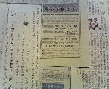 ●PIPOさん(6月号) ●とよたホームニュースさん(7月2日発行) ●新三河タイムスさん(6月30日発行) ●この指とまれさん(7月号) *なお、7月8日当日は、新三河タイムスの記者さんが取材に来てくれます(*^^*) 「モントトと仲間たちのホッと手作りまつり」 日時・・・2011年7月8日(金)10:30~~15:00 場所・・・豊田産業文化センター 多目的ホール (愛知県豊田市小坂本町)(愛環新豊田駅、名鉄豊田駅 徒歩5分) * 素敵な作品が当たる抽選会あります(先着200名様までクジが引けます。9時ごろより整理券になる抽選券つきMAPを配布します) 東日本大震災の義援金の募金箱を置かせていただきます。ご協力をお願いいたします