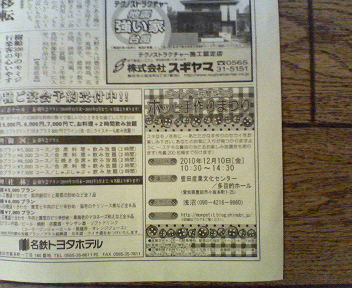 *2010年12月10日(金)10:30~14:30 *豊田産業文化センター 多目的ホール (愛知県豊田市小坂本町) *23ブース、抽選会あり 12月10日(金)の「モントトと仲間たちのホッと手作りまつり」のイベント情報を地元各紙に掲載していただいています。 今日は、新三河タイムスさんに掲載。 イベント日には、取材に来てくださるそうで、その記事は12月16日に掲載される予定です(*^^*) そのほか、コラボさん、PIPOさん、この指とまれさんにイベント情報の掲載をしていただいています。 今週土曜日には、中日ホームニュースにも掲載しますので、詳細をお確かめのうえ遊びにいらしてくださいね(*^^*)