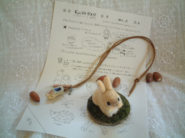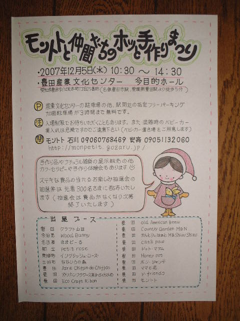 × [PR]上記の広告は3ヶ月以上新規記事投稿のないブログに表示されています。新しい記事を書く事で広告が消えます。 明日のイベントの手作り体験会の作品です~(*^^*) 来年の干支のねずみさんのペイントドール「着ぐるみチューチュー」を描いていただきます。後ろが見えないですが、ちゃんとかわいいしっぽもついていますよ~~♪ かなりの部分まで出来上がっていますので顔に少しお化粧をして花束を描いてもらえばできあがりです。だいたい10分~20分でできると思います。 絵の苦手な方や絵筆を持つのは中学以来という方でも大丈夫♪ 材料込みで500円です。 体験会で発生したすべての収益は「交通遺児さんのための寄付」として豊田社協さんへお届けします(*^^*) *モントトと仲間たちのホッと手作りまつり* 2007年12月5日(水)10:30~~14:30 豊田産業文化センター 多目的ホール (愛知県豊田市小坂本町 名鉄豊田市駅、愛環新豊田より徒歩5分) 駐車場は、産業文化センターのほか駅周辺の加盟フリーパーキングが 3時間まで無料です。できればお乗り合わせや公共交通機関をお使い くださいませ。 毎回好評の素敵な手作り作品や雑貨が当たる抽選会は、抽選券つき会場MAPを先着300名さまに配らせていただきますので、抽選コーナーにて抽選券とお引き換えにくじを引いてくださいませ(*^^*) PR 来週の5日(水)にはイベントです~(*^^*) 少し前のイベントから「モントトだより」(フリーペーパー)というのを出させていただいていて5日には3回目の発行となります。 会場MAPの裏側が「モントトだより」になっています。 今回は、冬の風邪予防対策のちょっとしたことと、フリーの図案を描かせていただきました。刺繍や消しゴムハンコなどに使って楽しんでもらえるとうれしいです♪ 「モントトだより」は会場前でお配りさせていただいています。 よかったら読んでみてくださいネ。 画像の羊毛うさぎさんと小さなオランダ靴のネックレスもイベントに持っていくものです。よかったら見てくださいネ~(^^) *モントトと仲間たちのホッと手作りまつり* 2007年12月5日(水)10:30~~14:30 豊田産業文化センター 多目的ホール (愛知県豊田市小坂本町 名鉄豊田市駅、愛環新豊田より徒歩5分) 駐車場は、産業文化センターのほか駅周辺の加盟フリーパーキングが 3時間まで無料です。できればお乗り合わせや公共交通機関をお使い くださいませ。 毎回好評の素敵な手作り作品や雑貨が当たる抽選会は、抽選券つき会場MAPを先着300名さまに配らせていただきますので、抽選コーナーにて抽選券とお引き換えにくじを引いてくださいませ(*^^*) チラシを撮ってみました~~(*^^*) パソコンで作ったり、業者さんに頼むこともできるんだろうけど、モントトはとにかく何でも「手作り」です~(単にPC技術がないだけだったりします^^;) 手作りできるものはしたほうが経費的にGOODなので出店者さんにも負担がかからないかな~と思って・・・(^^) 毎回好評の素敵な手作り作品や雑貨の当たる抽選会ですが、今回は先着300名様に抽選券(会場MAPについています)を配布させていただきますので、その抽選券とお引き換えに抽選コーナーでくじを引いてくださいネ♪ モントトと仲間たちのホッと手作りまつり *2007年12月5日(水)10:30~~14:30 *豊田産業文化センター 多目的ホール (愛知県豊田市小坂本町、JR愛環 新豊田駅、名鉄 豊田駅 徒歩5分) ただいま書店にて発売中の「コットン&ペイント」のイベントカレンダーのページと「クラフェ」の105ページにも↑の情報を掲載していただいています(*^^*)